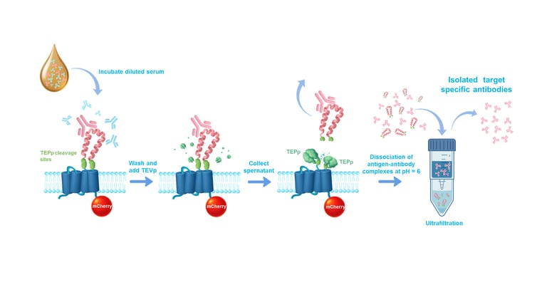 ENCORE-CAPTURE - an innovative cell-based platform engineered for precise and efficient antibody isolation. This cutting-edge technology utilizes tANCHORed surface-displayed antigens to capture antibodies from various sources, such as human serum, followed by a TEV protease dependent controlled release of antigen-antibody complexes for downstream applications.